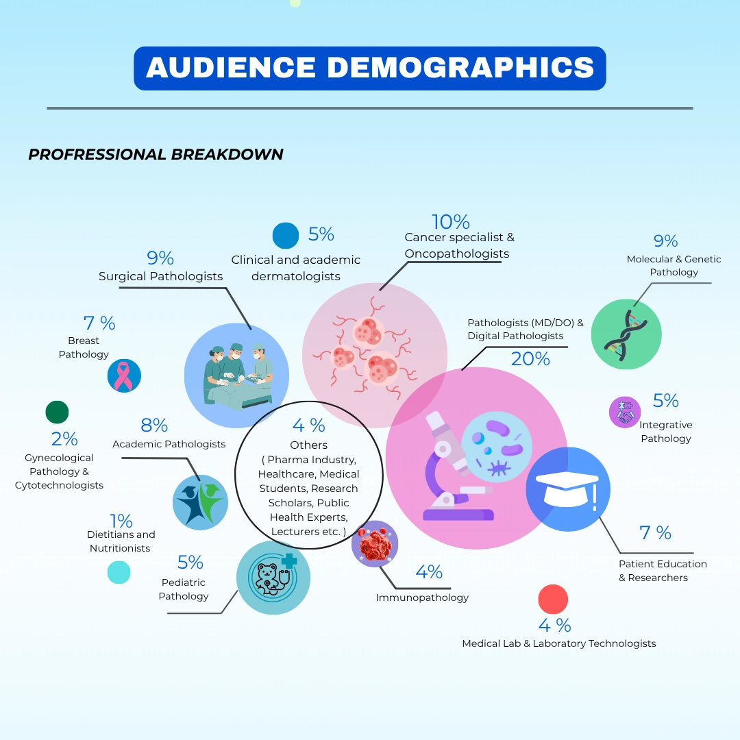 Our audience consists of a diverse range of healthcare professionals and experts, with strong representation across multiple specialties in the field of pathology and related disciplines. Here's a closer look at who makes up our professional community: